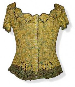 Knit from the top down, the technique to make the lace edging is quite simple. Make this as long or as short as you like. Buttonholes may be worked, or just sew the fronts together and sew buttons on top and pull the top over the head!