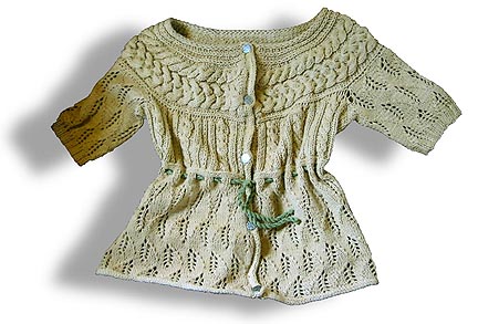 The cardigan is built off of a curved, cabled yoke, worked from the neck down with shaping incorporated into the charted patterns. The sleeves are picked up and knit from the armholes out.