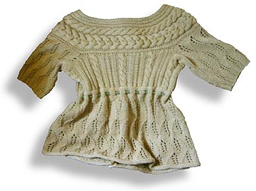 Using worsted weight yarn and larger needles, 4.5 spi x 5 rpi in bodice cable patt.