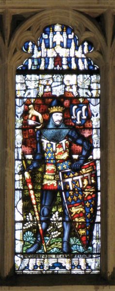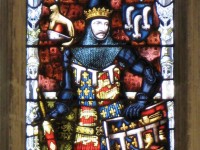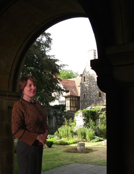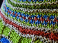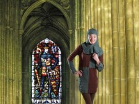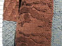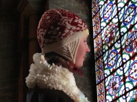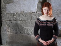Based on the battle tunic worn by the Black Prince (Edward of Woodstock) on his funeral effigy at Canterbury Cathedral. The front of the tunic features the emblems of Edward’s shield (Lion & Fleur de Lys) in alternating blocks of color. The back of the tunic is simply ribbed to create a smoother fit. The sleeves are worked in jacquard knit/purl patterning.