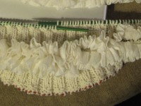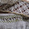 A pattern from the book, History on Two Needles, this three tiered shrawl (shawl + shrug) has three layers of lacy knitting based on a knitted merino body with armholes for a secure fit.