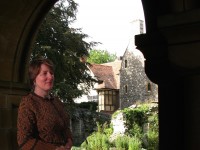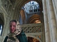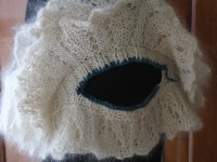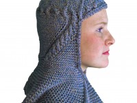 Based on the battle headgear worn by the Black Prince (Edward of Woodstock) on his funeral effigy at Canterbury Cathedral. The hood is worked from the chin up, then the original stitches are picked up and the loose shoulder section is added to finish the helm.
