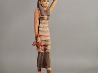 Inspired by the garment of a tiny figurine discovered in Thebes, the Egyptian net dress is re-imagined as a close fitting skirt and top with an all-over color work pattern.