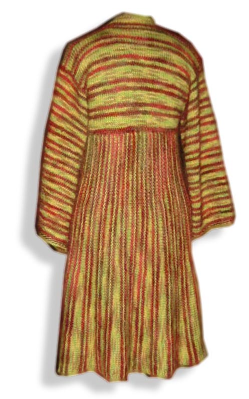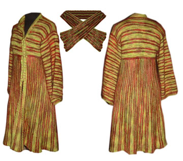 The skirt of the jacket is worked first from side to side using short row shaping. Stitches are picked up for the bodice, and sleeves. The fronts are finished using a twisted float trim and i-cord ties, an optional mohair/silk scarf completes the look.
